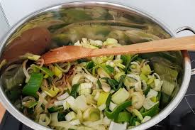 Dans une casserole sur feu moyen, faire frire le bacon…..Ajouter les poireaux. Les faire suer 2 à 3 mn….. puis verser le bouillon et mélanger … .