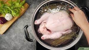 Dans un faitout, mettre le poulet + persil & céleri + 1 cuillère à café de gros sel + grains de poivre. Verser de l’eau à ras du poulet. Porter à ébullition …. Couvrir pour 1 heure à feu doux: dès que le poulet est tendre, le retirer du feu mais le laisser refroidir dans le bouillon.