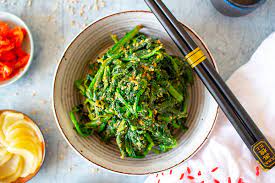Dans un bol, fouetter 3 mn sucre + Mirin + jus de citron + sauce soja + aji-no-moto………. verser la moitié sur les épinards et servir le reste à côté: chacun se servira pour tremper les épinards tièdes ou froids dedans.