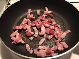 Sortir les oignons de la poêle. A leur place, mettre les lardons + 20 g de beurre à dorer sur feu moyen ( 4 à 5 mn).