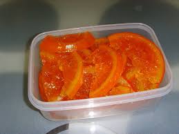Hacher + ou – grossièrement les écorces d’oranges confites.