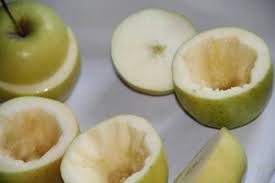 Peler ( ou pas) les pommes. Leur couper un chapeau …… Les creuser et les évider largement sans entamer le pourtour…… Arroser de jus de citron pour les empêcher de noircir.
