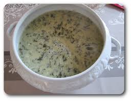 - — Incorporer rapidement au fouet le bol de crème fraîche dans la soupe à l’oseille ….. Servir un bol de soupe par convive.