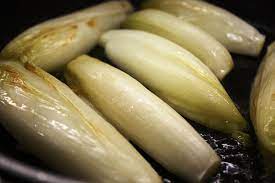 Dans une sauteuse, sur feu assez vif, mettre les endives côte à côte + 25 g de beurre. Saler. Arroser de jus de citron. Remplir d’eau à mi-hauteur des endives. Couvrir. Laisser cuire environ 30 mn en retournant les endives au moins 1 fois.