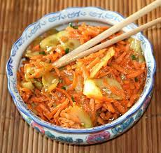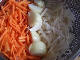 Peler navets + carottes + oignons ……. Les râper avec une râpe à gros trous — ou bien les tailler en julienne ( fins bâtonnets = allumettes)……