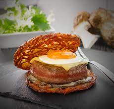 Pour servir: – Répartir un lit de champignons sur chaque assiette ……….. Déposer 1 tranche de pain grillé au centre de chaque assiette ………. Couvrir le pain avec 1 tournedos .………….. puis 1 oeuf sur le plat. Napper du jus de cuisson de la viande.