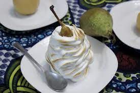 Monter les blancs d’oeufs + le sel en neige ferme …. + 100 g de sucre + le sucre vanillé ……………. . Verser cette mousse sur les poires à la cuillère ou à la poche à douille ……….