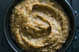 Sortir les aubergines. Les couper en 2. Prélever la pulpe à la cuillère …. Hacher finement cette pulpe en purée ………………………. L’ajouter à la purée de pommes de terre et bien travailler le tout pour avoir une purée homogène.