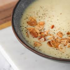 Répartir la potage dans les assiettes ou les bols… Au dernier moment, répartir dessus les amandes grillées.