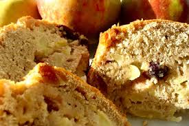 Dans un saladier, mélanger les 2 farines + sel + sucre + levure …….. + jus de citron + raisins égouttés + fruits confits + 1 pomme en tranches. Bien pétrir le tout et rajouter qq cuillères de lait si vous trouvez la pâte un peu trop compacte ….. La mettre en boule.
