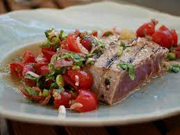 Verser la moitié de ce mélange dans un grand plat ….. Poser dessus les tranches de thon ….. Recouvrir du reste de marinade.