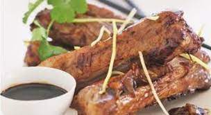 Dans une poêle sur feu moyen, chauffer l’huile. Y faire dorer et cuire les côtes de porc avec leur marinade, environ 6 mn ………………..Puis les retourner, ajouter les lamelles de gingembre et poursuivre la cuisson 6 mn .