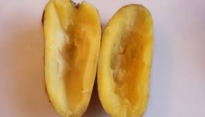 - Couper les grosses pommes de terre en 2 ( si elles ne sont pas très grosses, prenez-en 8 et leur couper seulement un chapeau). Creuser l’intérieur en laissant 1/2 cm de pulpe autour et ne pas percer la peau.