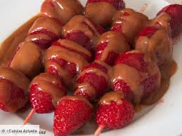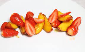 - Façonner les brochettes en enfilant sur chacune, en les alternant, 4 morceaux de pêches + 3 fraises.