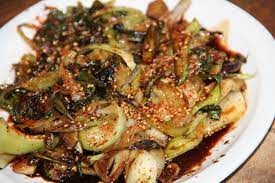 - Le poisson: – Pendant ce temps, chauffer le reste d’huile dans une poêle sur feu vif. Y saisir les filets de truites 1 mn de chaque côté ……….. Oter du feu et rapidement, ajouter ail + sauce soja + piment .…… Poursuivre la cuisson 3 mn ..