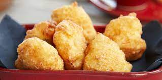 Par petite quantité, donc en plusieurs fournées pour ne pas que les beignets collent entre eux, passer chaque languette de viande 1) dans la pâte à frire … et 2) les plonger dans l’huile bouillante pour les faire dorer ……….
