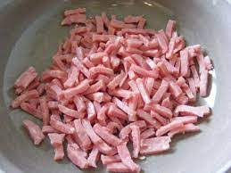 - Dans une poêle, chauffer 1 c à s d’huile. Sur feu doux, y faire suer l’oignon ( 4 mn) ……….. Ajouter le jambon et mélanger 1 mn ……. Oter du feu et sortir le tout de la poêle.