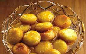 1 par 1, tremper les gâteaux dans le sirop encore chaud pour qu’ils en soient bien imbibés ……… puis retirer les pics en bois et disposer tous les gâteaux dans une coupe … Les arroser du reste de sirop.