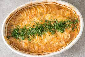 - Beurrer largement un plat à gratin. Disposer la moitié des oignons au fond du plat ………. Recouvrir d’1/3 des pommes de terre . Saler, poivrer ………….. Disperser la moitié des cubes de viande par dessus. Saler, poivrer. Parsemer de ciboulette ………… Placer le reste des oignons. Saler, poivrer…………. Couvrir d’1/3 des pommes de terre. Saler, poivrer …………… Etaler le reste de viande + sel + poivre + de la ciboulette ……………. Terminer par le reste de pommes de terre + sel + poivre + ciboulette ……………