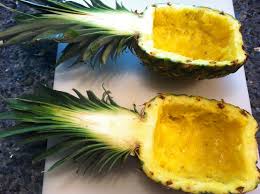 Couper l’ananas en 2. Evider chaque moitié dans lesquelles vous présenterez la salade de fruits ….. Détailler la pulpe d »ananas en dés ( retirer le coeur dur).