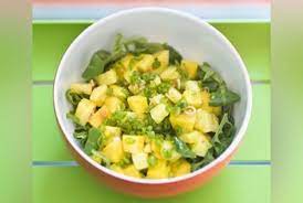 Répartir la salade dans les 2 moitiés évidées d’ananas.