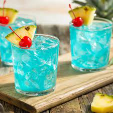 - Dans un shaker ou un mixeur, mettre 2 glaçons + Curaçao + Rhum + jus d’ananas + lait de coco + crème fraîche. Agiter ou mixer qq secondes.