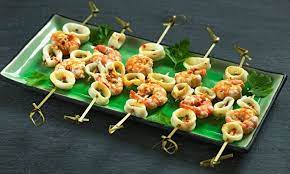- Façonner les brochettes en enfilant soit en les alternant sur chaque pic, soit en faisant des brochettes de taille plus petite des 3 éléments séparément: langoustines — écrevisses — encornets ou calmars.