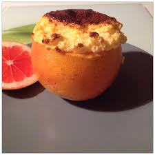 - Monter les blancs d’oeufs en neige très ferme + le sucre glace peu à peu…. A la poche à douille ou à la cuillère, répartir joliment la meringue sur les pamplemousses.