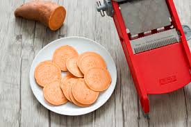 Peler, rincer et sécher les patates douces. Les couper en très fines rondelles.