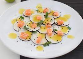 - Pour servir: – Sortir le saumon du frigo. Le mélanger avec le radis noir…….. Disposer ce mélange au centre de chaque assiette….. Arroser avec la marinade du saumon.