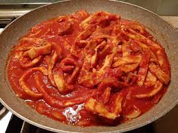 - Rouler chaque omelette et les découper en lanières……. Incorporer les lanières d’omelettes dans la sauce tomate et poursuivre la cuisson 5 mn.