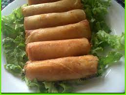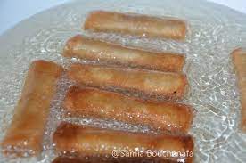 Réduire la température à petit frémissement et plonger, par fournées successives pour ne pas qu’ils collent entre eux, qq cigares sortis du frigo dans l’huile bien chaude. Les faire dorer de chaque côté …….. puis les sortir sur du papier absorbant.