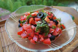 Couper en rondelles tomates + olives.