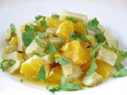 –Dans un saladier, mélanger délicatement fonds d’artichauts + tomates + olives + oranges.