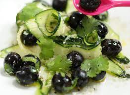 Dans un saladier, réunir courgettes + olives + coriandre ou persil…. Arroser du contenu du bol et bien mélanger.