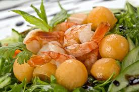 — Couper le melon en 2. Retirer les pépins …. Prélever la chair du melon avec une cuillère parisienne pour obtenir des petites boules que vous disposez au centre de la laitue.