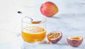 - Pendant ce temps, préparer le coulis: – Couper les fruits de la passion en 2. A la petite cuillère, prélever la pulpe que vous mettez dans un mixeur. Mixer qq secondes … puis filtrer dans un chinois ( dans une passoire fine) pour ne recueillir que le jus.