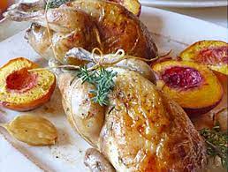 - Les cailles étant bien dorées, les saler et poivrer. Leur ajouter vin doux + pêches + raisins macérés au Cognac + cannelle. Couvrir. Poursuivre la cuisson 15 à 20 mn .... .