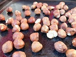 Dans une poêle sur feu doux, faire griller ( torréfier) les noisettes …… Oter du feu. Les hacher grossièrement.