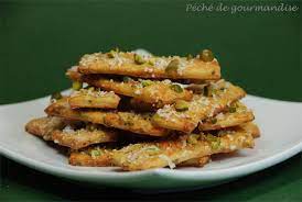 Badigeonner chaque forme avec du blanc d’oeuf .. Parsemer de pistaches + graines … + Parmesan.