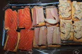 - Pour servir, disposer joliment sur chaque assiette, côte à côte: – 1 tranche de saumon fumé — 1 tranche de saumon mariné — Démouler 1 ramequin de timbale de renne … disposer dessus qq oeufs de saumon — qq cuillerées d’oeuf brouillés à l’anguille — qq cuillères de gubbrôra aux anchois — 2 c à s d’oeufs d’ablette –—