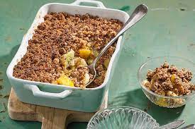 - Pâte à crumble: – Dans un saladier, mélanger du bout des doigts 75 g de beurre + la farine pour obtenir une pâte sableuse … puis incorporer la noix de coco + le reste de sucre ( 50 g) et bien pétrir à nouveau……… Parsemer le plat ou les ramequins de cette préparation.