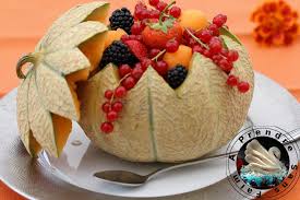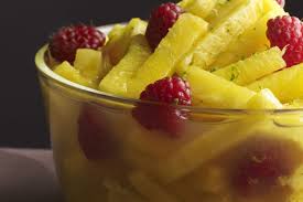 **Dans un saladier, mélanger ananas + pêches + melon + framboises + groseilles. Placer au frigo.