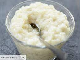 - Dans une casserole, porter à ébullition 50 cl ( 1/2 litre) de lait + 50 cl d’eau + 80 g de sucre + 1 pincée de sel …… Y plonger le riz et bien mélanger…. Oter du feu et incorporer les 2 jaunes d’oeufs……