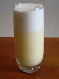 Dans un shaker, bien secouer, à faire mousser, les 2 jus de fruits + la crème fraîche + le jaune d’oeuf + le sucre …….