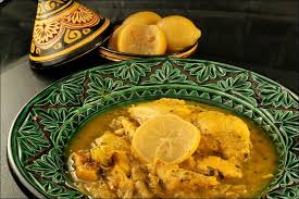 - Dans une cocotte, chauffer l’huile. Y faire blondir l’oignon ( 3 mn) ……… Ajouter poulet + agneau + sel + poivre. Bien mélanger ……. ( 7 à 8 mn) ……… Ajouter citrons confits + laurier. Verser de l’eau à ras des viandes. Porter à ébullition…. puis couvrir Baisser le feu et laisser mijoter 1 heure 30 mn.