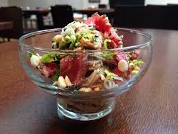 - Pour servir: – Répartir la salade de boeuf sortie du frigo dans 4 coupes ou bols……….. Parsemer de noix de cajou + cacahuètes + sésame grillé…….. Arroser d‘1 trait d’huile de sésame …. Poudrer chaque salade d’1 petite pincée de piment.