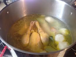 - Dans une cocotte ou autre bassine, chauffer l’huile. Y faire dorer le poulet de tous côtés.. ( 10 mn) …….. L’arroser de bouillon.. Couvrir. Laisser mijoter une bonne heure en tournant le poulet 1 à 2 fois.