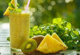 Déposer 2 glaçons par verre. Répartir la précédente préparation….. Ajouter le jus d’ananas et compléter les verres avec du Perrier bien frais.