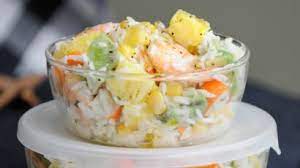 - Peler les bananes. Les couper en rondelles pas trop fines. Mettre pomme + bananes dans un saladier. Arroser de jus de citron pour les empêcher de noircir….. Ajouter le riz froid + les noisettes …… + les raisins secs égouttés + le raisin frais ….. + l’ananas. Bien mélanger.